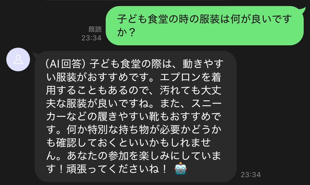 「〇〇(※団体名)教えて」というトリガーワードや、特定の単語(例:「持ち物」「集合場所」)でAIが自動的に質問に回答します。ベクトル検索とGPTによる自然な回答生成で、参加者の疑問を即座に解消します。